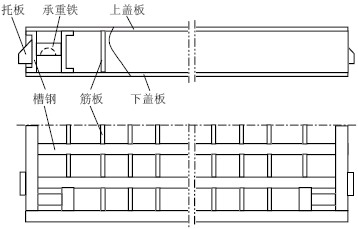 其中,SCS-50 系列汽车衡中节由纵向6 根槽钢、横向2 根槽钢,上下焊接钢板,槽钢间均布筋板形成箱型结构。中节的总体尺寸为:5m×3m×0.3m,结构示意图如图1 所示。