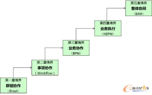 业务流程管理的五重境界有一定的递进层次,但也不是绝对的有先后次序之分,在实际实施与应用过程中,往往会将其中的技术融合在一起。在实现业务流程管理中最根本的原则还是需要根据企业的管理现状、未来发展、可能的投资选择合适的技术来支撑。