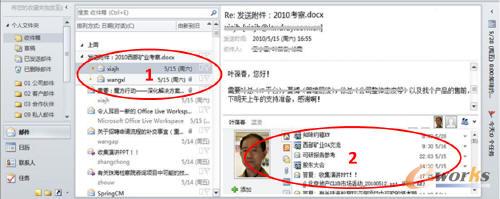 目前电子邮件技术已非常成熟,主流的产品包括IBM Lotus、微软Exchange、国内CoreMail等邮件系统,企业可以根据IT基础设施现状及使用习惯进行选择。在选择电子邮件前端工具时需要考虑易用性等,如下图的工具可以将同一封邮件的多人回复自动归类,方便地查看到整个事情的处理流程和过程(下图①所示),同时还可以查看相关人员与自己沟通的所有邮件(下图②)。