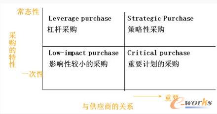 供应商的供货分类完全可以按照依采购特性及与供应商之关系来订定采购策略,这一方法,就是如下图所示方式,将料件进行分类,相应的供应商的落入对应区域。